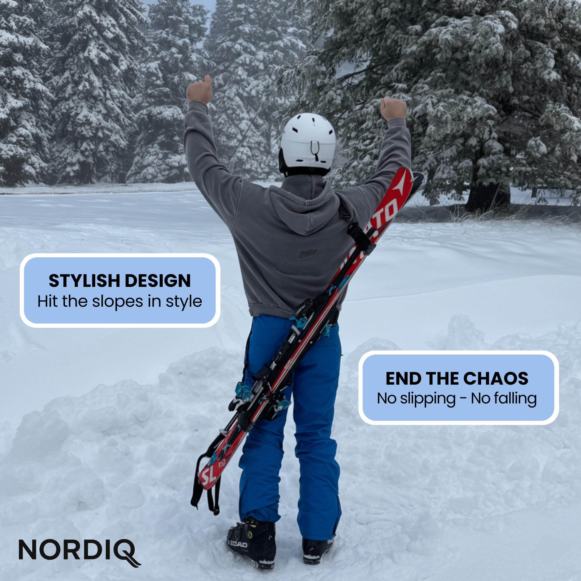 Carrying ski gear should not be hard or painful. With Nordiq GripStrap, your gear stay tight, safe, and easy to carry. No more gear mess. No more pain.